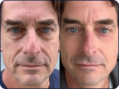This preserves your natural masculine character while eliminating the “permanently tired” look.